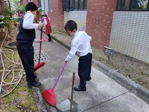 为了更好的发挥主人翁精神,自升上二年级始,学校后庭就成为二年级学生的清洁包干区。每天早上7:20分小小清洁员便来到后庭,在值日组长的安排下,孩子们分工合作:有的同学负责捡落在地上的树叶,有的负责捡花坛里的纸团。还有的负责扫地上的垃圾,孩子们干劲十足,不怕脏、不怕累。在大家的一番努力下,不一会就把学校后庭打扫得干干净净。同学们脸上露出了幸福的笑容。