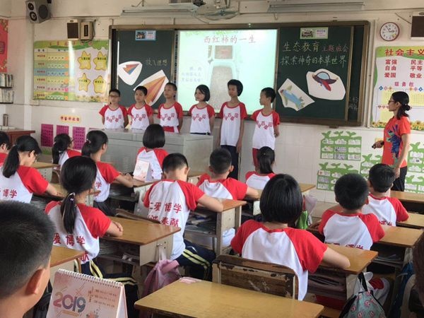 在种植实践篇里,学生们以小组的形式,分享着自己在百草园的实践故事,既展现了学生写作的能力,又锻炼了学生语言表达能力。在科普探究篇里,学生们分享了自己通过探究性学习,搜集植物资料,探究植物的药用价值和食用价值,制作植物名片的经历。学生们的表达条理性强,赢得了家长们的阵阵掌声。在诗情画意篇里,学生们分小组诵读自主创编的儿童诗《我想》和《可爱的本草》。这些诗歌的创作素材是学生们在百草园种植实践基地里细心观察,激发了探索学习的兴趣和丰富了想象力的结晶。在生命感悟篇里,学生们谈了自己播种、观察、培育西红柿成长的一个完整生命旅程的感悟。当学生们结合自己的实践,分享到要珍惜时间好好奋斗,感谢犹如西红柿一样的母亲把自己的精力用心地培育自己……一些听课的家长都感动得流下了眼泪。学生们在学习《梦想的力量》时,写下了自己的理想。在放飞梦想时,学生自信大方地跟家长们、来宾们分享自己的理想。通过诵读百草公约,学生们希望自己成为一名拥有仁爱之心,修炼崇高德行,学会博学进取,做事精益求精,为人诚实守信,乐于奉献社会的阳光学子。