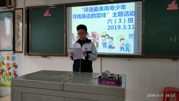 接着,各班将“评选最美南粤少年”主题活动与弘扬雷锋精神活动结合起来,让本班的最美南粤少年进行演讲,号召同学们“寻找身边的雷锋”。他们用富有感染力的语言,激发了同学们学习雷锋的热情,让同学们明白——学雷锋不是为了得到表扬,而是在尽自己所能去帮助他人,去创建一个和谐温暖的生活环境。