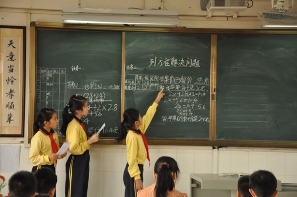 随着清脆的上课铃声响起,五年级的徐惠霞主任为参与研讨活动的老师们上了一节精彩的小组合作学习研讨展示课《列方程解决问题》。徐主任采用了小组合作模式充分体现了“自主学习、自主探究”的教学特点,通过多次的小组合作学习来展现学生对解方程的理解,使学生乐在课堂中。学生以小组合作的形式对例题进行研究,然后把小组研究成果板书到黑板上,再展示给大家看,学生的精彩讲演赢得了阵阵掌声。学生们在在愉快的合作过程中学到知识。