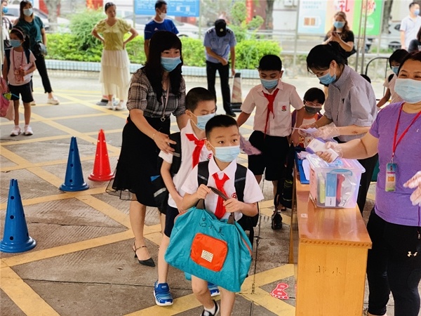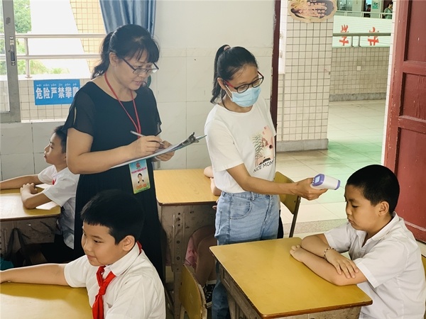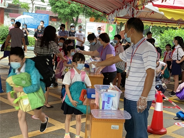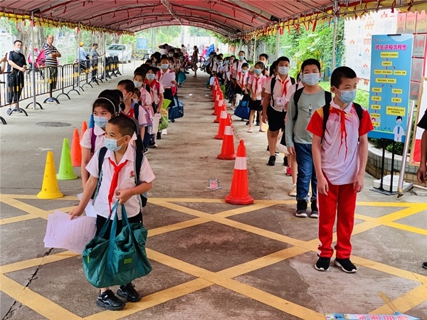 通往校园的河涌路上,孩子们按照学校制定的上学时间,实行错峰上学。越靠近北区小学的遮雨棚,越看清排队的孩子们一脸认真,听从现场值日老师的引导,快速进入校园!今天是一、二和三年级返校复课的第二天,经过昨天的校园生活,低年级孩子们已经了解上学的秩序,学校的行政班子依然不懈怠地早早在校门口做好迎接全校学生上学的准备,即使是已经熟悉的测量体温工作,值日老师们都一丝不苟地对待,面对全校学生错峰进入校园,压力不可小视,这种认真对待的态度是北小一贯的常态!