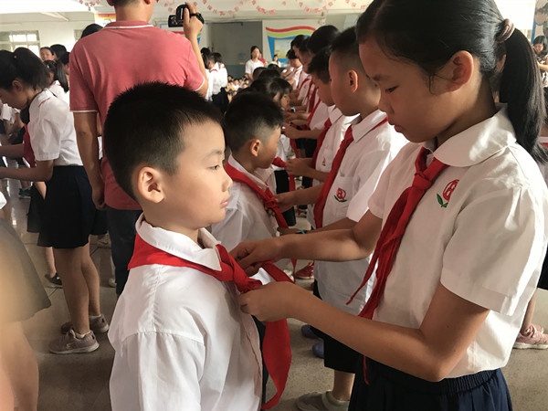 各班级以年级为单位整队报数后是新队员的入队仪式,北区小学二、三年级一共84名新队员光荣地加入少先队,在欢快的歌声中,高年级的大哥哥大姐姐庄严地为新队员佩戴上鲜艳的红领巾,全体新队员在大队副辅导员朱美桃老师的带领下庄严宣誓,为共产主义事业贡献力量,二(1)班新队员代表杨烨婷同学代表全体新队员表心志,五(3)班老队员代表黄绮梦同学向新队员提出倡议和希望。
