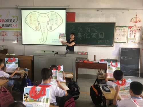 主题班队会上,各班主任先给学生派发由小榄镇生活垃圾分类收集实施工作协调小学宣制的“垃圾分类、环境OK、和美小学、你我共创”的环保购物袋和宣传单张,购物袋上印有四项垃圾分类的内容,各班主任针对垃圾分类的内容给学生展开了详细的解说,并结合相关课件的内容为学生们讲解了垃圾分类的重要性和对保护环境的重要作用,要求全体学生在学习完垃圾分类的有关内容后回家要做好“小老师”,把垃圾分类的相关知识传递给家人、邻居和亲朋好友们,带领他们一起加入生活垃圾分类的队伍中。