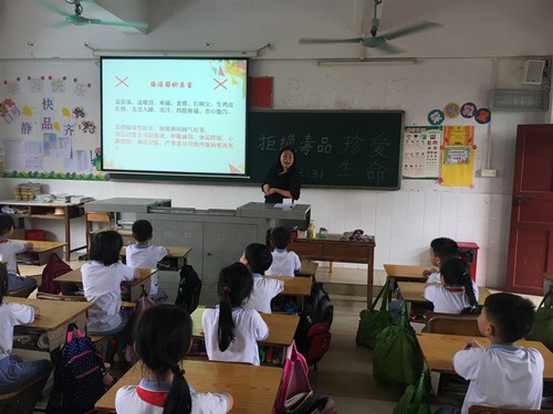 在班会课前,学校通过国旗下的讲话、红领巾广播站等活动,让学生了解毒品与禁毒的有关知识。班会课上,老师们首先向学生宣讲了世界禁毒日的意义和由来,讲述了吸毒对身心健康的危害及吸毒给人带来的各项疾病的相关知识,介绍当前禁毒形势及相关禁毒法律、法规,发出了“从我做起,拒绝毒品,珍爱生命”的倡议。接着通过一段段触目惊心的视频、一桩桩发人深省的个案、一个个支离破碎的家庭,让学生受到强烈的震撼。最后老师们告诫孩子们谨慎交友,提高对毒品诱惑的警惕性,增强远离毒品、拒绝毒品和自我防范的意识及能力。