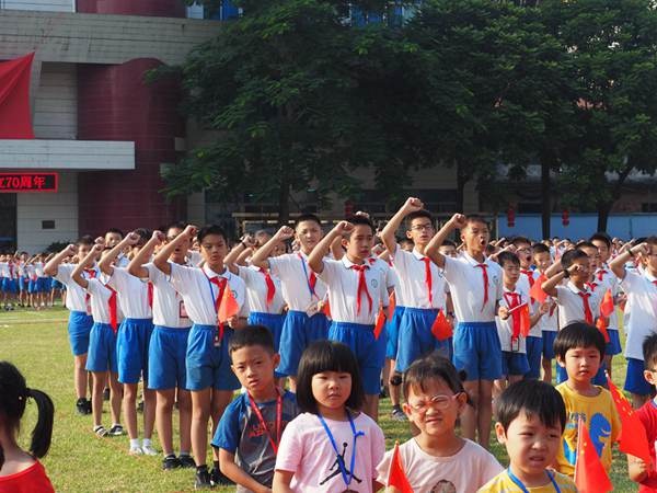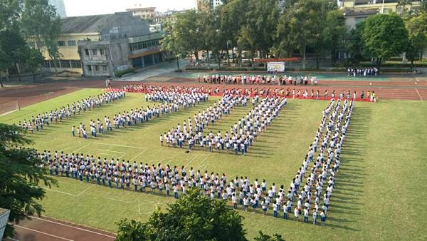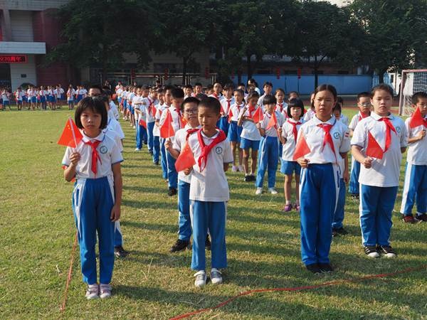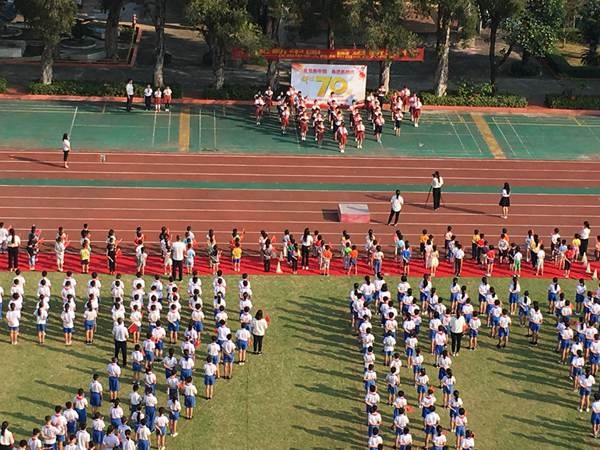 为了营造热烈的气氛,德星小学全校师生在国庆前一周,利用每天下午大课间的时间,连续数天在热辣辣的小榄学院操场草坪上摆出“70”两个颇具意义的人体大型方阵造型,以此来表达对祖国的崇敬和热爱。