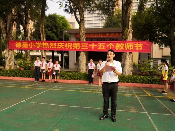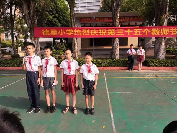 早上8点,德星小学第二周升旗仪式准时开始,当五星红旗在肃穆中徐徐升起后,学校两位学生主持宣布“德星小学热烈庆祝第35个教师节”活动现在开始!