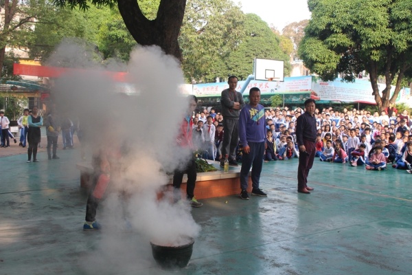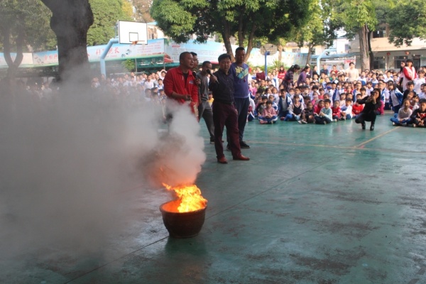 然后,由吉锋老师对全校教师进行灭火的知识培训。吉锋老师用汽油点燃了一些衣物,熊熊大火立马就燃烧起来了。他接着介绍灭火器的使用方法,拨开保险栓,用喷嘴对准火的根部,一下子就把火扑灭了。通过老师的灭火示范,同学们都认真地看着、学着,一下子就掌握了使用灭火器的方法。
