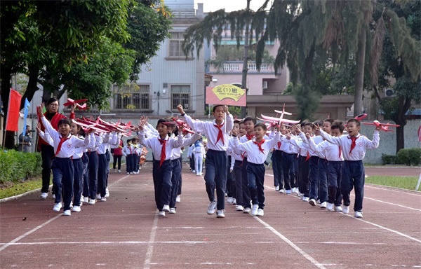 随后进行的是精彩的团体表演,一二年级小朋友带来的律动操《爱心大无限》,动感活泼;五六年级学生表演的花样跑操,在跑步过程中不断变化队形,跑出了奥运五环,创造性地将集体跑操玩出了新花样;三四年级学生舞动科技,用智慧诠释科技,演绎学校科技特色。开幕式还有幸邀请到了“小榄教师六一飞行表演队”带来了精彩的航模表演。