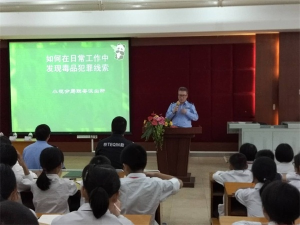 活动中,何永光警长通过图片分类介绍了毒品的种类,认真宣传毒品知识,现场向同学们展览毒品仿真样品,讲解毒品,加深了同学们对毒品的认识。同时通过讲述真实案例,观看视频向学生说明毒品给家庭、给社会带来的巨大危害, 进一步增强了同学们对毒品的抵抗能力。最后何警官从“如何在日常工作中发现毒品犯罪线索”方面进行详细介绍,教给和警示同学们远离毒品的方法。同学们在认真听讲中,懂得了要热爱生活,珍惜生命,文明健康地生活;要遵纪守法,抵制诱惑,远离毒品。本次讲座令高年级同学们获益良多,思考颇丰。