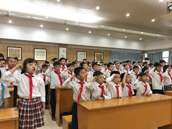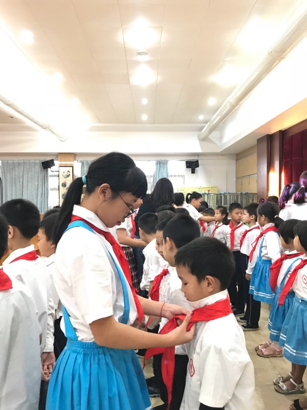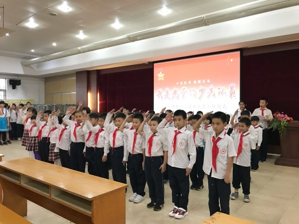 新队员的入队仪式在学校五楼阶梯室举行。随着主持人的致辞,入队仪式拉开了帷幕!在出旗曲响起之际,同学们难掩激动的心情,面向队旗,嘹亮的队歌声回荡在阶梯室。在大队辅导员梁雯筠老师宣读了新队员名单后,125名新队员踏着欢快的步伐,分批上前接受六年级优秀队员代表们为他们佩戴上鲜艳的红领巾。在大队长冼丽诗同学的带领下,在鲜艳的队旗见证下,新队员肃然起敬,高举右手,声音整齐而激昂地宣誓和呼号。接着,一年级优秀队员代表作了激情发言,辅导员梁老师也发表了热情洋溢的讲话,祝贺新队员光荣入队,同时也希望新队员能好好学习,争取全面发展。最后,在退旗曲声中,入队仪式圆满结束。