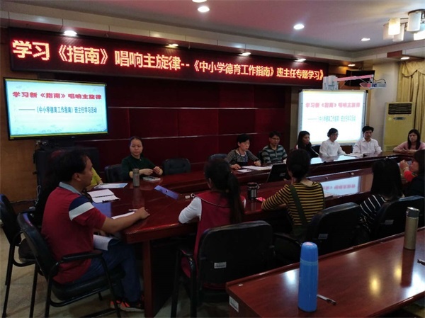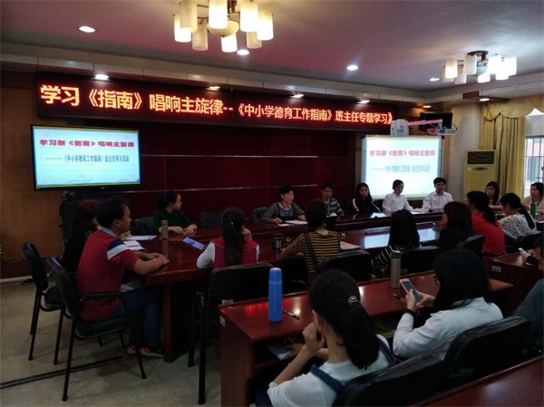 会上,学校主管德育工作的汪雁苑副校长首先带领全体班主任对《指南》进行学习解读,从常规奠基础、目标为动力、合作求共赢、环境要重视、实际是起点、行动最关键六个方面,向全体班主任老师交流了个人学习《指南》精神的体会。接着结合开学以来学校工作实际,对全体班主任老师提出了具体的要求和期望。她要求全体班主任明确自身职责,针对当前实际,注重德育工作的规范性和实效性,希望老师们通过认真研读《指南》,不断促进自身工作的专业性,提升德育专业能力的热潮,促使班主任工作向智慧型转变。