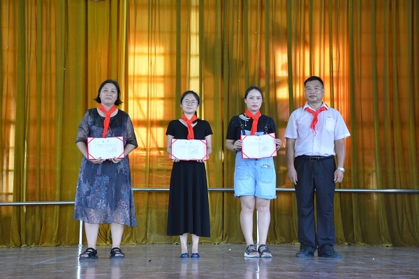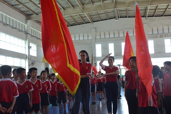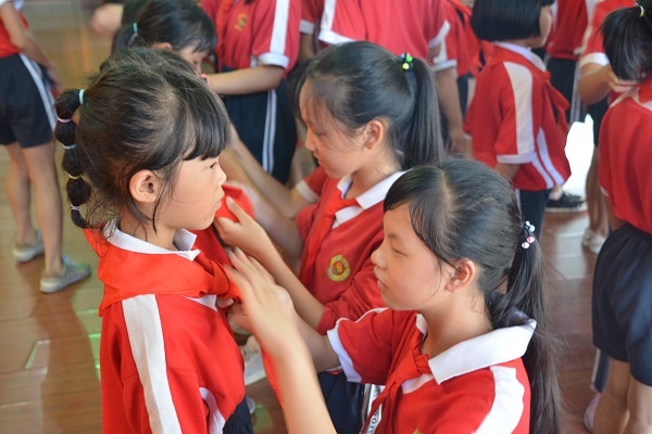 宣誓完成后,大队辅导员为一年级三个新建中队授旗,陈凯讯副校长和三位队员给一年级新建中队的三位辅导员佩戴红领巾以及颁发聘书。大队辅导员还用热情洋溢的讲话激励“小红领巾们”做好榜样,发挥先锋作用,为鲜艳的红领巾增添光彩。最后,大队辅导员带领着全校少先队员们呼号,全体少先队员们高声回应着:“时刻准备着!”