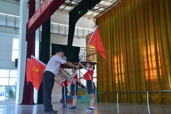 为了迎接这个特殊日子的到来,一年级的60名新队员们都穿上了整洁的衣服,排着整齐的队伍。小主持人吴洋逸指领着各中队的中队长整理队伍,随着雄壮的国歌声奏起,队员们响亮地唱起国歌。国歌声中,五星红旗徐徐升起。庄严的升旗仪式结束后,鼓号队队员们奏响了《出旗曲》,旗手们英姿飒爽地出队旗。望着鲜艳的少年先锋队队旗,队员们响亮地唱着《中国少年先锋队队歌》。队旗高高的飘扬,星星火炬闪耀着金光,队鼓铿锵而嘹亮,召唤着伙伴响彻四方。