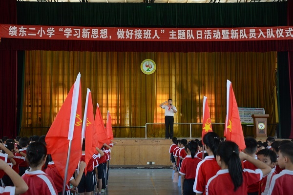 又是一个阳光灿烂的日子。火红的队旗高高飘扬,指引着少先队员们前进的方向。2019年6月21日星期五,在中山市小榄镇绩东二小学的体育馆里,举行了“学习新思想,做好接班人”主题队日活动暨新队员入队仪式。
