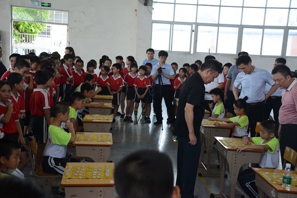 绩东二小学李彦峰校长为本次揭牌仪式致辞。他回顾了学校的象棋特色发展历程和措施:1.把象棋课列为一二年级的普及课;三-六年级开展提高兴趣班;到今年为止,学校已经有2/3的学生参加过象棋课程;2. 拥有(持有中国象棋协会教练员证书)的专职象棋教练员1;3. 定期训练、定期举行校内小型比赛、定期邀请国家大师黄仕清与学生棋手多交流切磋;4.积极参与镇内、市内、省内的等大型比赛;李彦峰校长还介绍了学校所取得的省市冠军等成绩。