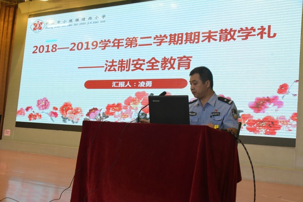 在鲜红的国旗、振奋人心的奏唱国歌中拉开了散学礼序幕。首先,法制警官凌勇介绍了《未成年保护法》中的行为准则,列举了九种不良行为,增强了学生自我防范的意识,提醒同学们交通安全常记心中,引导学生健康上网,拒绝沉迷游戏,合理安排假期时间,并在有趣的图文中让孩子们认识了什么是扫黑除恶。