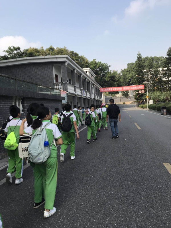 活动前各班进行了安全教育,分好小组,选好小组长,8点钟在学校操场上进行了庄严的升旗仪式。8点15分学生们登上了旅游大巴,前往第一站——黄埔军校。一下车一批军人动作整齐有序的在路上行走,班级队伍顿时鸦雀无声。走进军校学生们认真观看军校的每一个角落,围着讲解员不停地问,不停地做记录,亲身感受到革命先辈们的爱国情怀,在那样艰苦的年代里黄埔军校为中国革命培养出大批军事人才,激起了学生们的爱国主义热情,增加了学生的求知欲,从而坚定了学生们努力学习的决心。