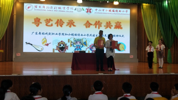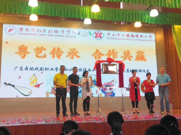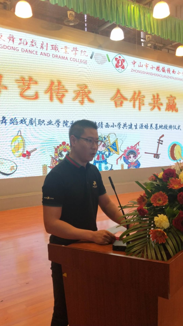 首先由小榄镇文体教育局局长卢颖禧先生致辞,他充分肯定了绩西小学在何桂雄校长的带领下,秉承“人人有素养,个个有特长”的办学理念,坚定走综合素养特色发展之路,十年来学校坚持开展戏曲进校园活动,全校师生掀起唱粤曲演粤剧热潮,在市级粤曲课题引领下,成立了“南国小红豆曲艺社团”和家长粤曲协会,“南国小红豆曲艺社团”荣获中山市优秀艺术社团称号。所排练节目先后参加国家、省、市、镇各级比赛表演30多场次,五十多人次获得金奖,硕果累累。杨卓琳、廖凯文、麦晓君、张伟仪、杨伦杰、何凯潮、陈樱尹七位同学通过考试被广东省舞蹈戏剧职业学院录取。学校粤曲粤剧教学成效显著,形成了鲜明的艺术教育特色,曲艺教学早已成为学校一张靓丽的名片,受到市内外广泛关注。今天广东舞蹈戏剧职业学院生源培养基地在绩西小学校授牌,希望绩西小学打造成为戏曲人才培养的摇篮,以生源培养基地授牌为锲机,依托名校,优化资源,努力提升戏曲教育教学水平,为社会输送更多品学兼优的高素质人才。