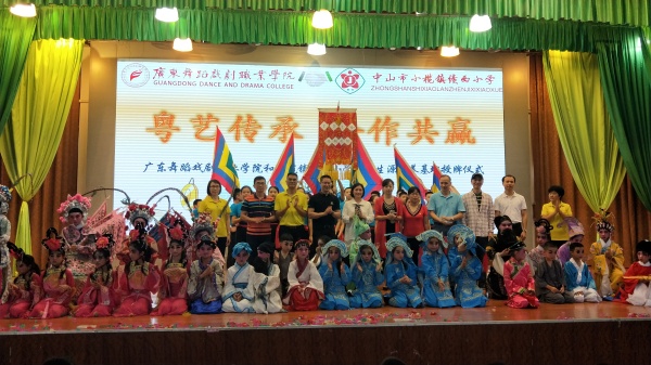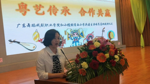 接着,广东舞蹈戏剧职业学院戏剧系支部书记、副主任黄燕女士致辞,她对绩西小学多年来在戏曲教育发展方面取得的成绩表示充分的肯定和赞许。她代表学院衷心希望与绩西小学实现资源共享、共同发展,双方进行全方位合作,发挥两校各自优势,全面交流合作,并为以后在戏曲项目发展领域上的合作建立一个坚实基础,努力扩大双方合作的深度和广度,实现互利共赢,进一步普及培训师资及人才培养,争取人力资源开发,增强动力,为培养高素质的粤剧人才添砖加瓦,为粤剧这一岭南瑰宝焕发青春活力,代代相传。