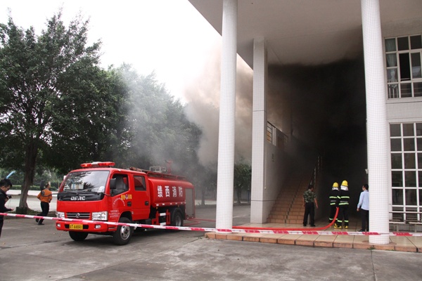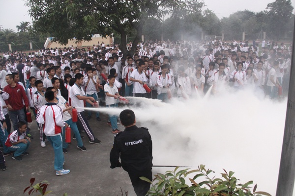 下午4:30分,随着学校有员工发现滚滚浓烟从饭堂冒出,立即向学校安全保卫组报告火情,接到和了解火灾警情后,学校第一时间启动火灾安全疏散应急预案并拉响警报,学生在老师的引导下有序、快速地疏散撤离。各行动组立即行动,各就各位,全副武装的消防员和消防车火速到场用消防车水枪进行灭火和救援。演习结束后,消防教官还现场给师生们讲解和演示了用灭火器和麻袋灭火的知识和操作技能与注意事项,之后部分师生亲自上场进行灭火操作实践体验。