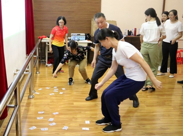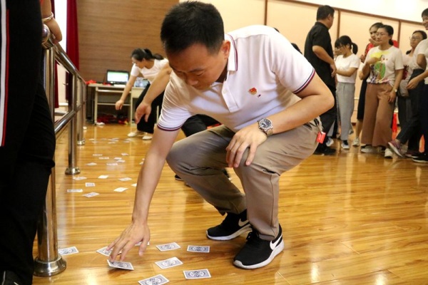 团康活动一开始,陈云炫老师指导40多位参与的老师围成一个大圆圈,让大家来了一场“大风吹小风吹”的热身活动,热身活动中大家反应敏捷动作迅速,在欢声笑语中很快融入了活动氛围。心理老师还为大家准备了小礼品“减压小贴士”,在“生日蛋糕”的活动中老师们感触很深,每位老师不分彼此,心连着心,真诚地为对方捶捶背,揉揉肩,拍拍后脑勺鼓励下对方。在“为你打call”环节中,老师们根据自己所报的数字分成了四组,老师们在规定的时间内为自己的小组取了别致又幽默的名字和口号:陈清茂校长、钟斌等老师所在的第一组为“天地壹号”组,杨青华副校长、杨建雄老师、杨理明老师等第二小组为“三杨开泰”组,许钦华、黄慧芳等第三组老师为“山竹与榴莲”组,刘伟、李涛老师带领的第四小组为“美女与野兽”组。在“扑克牌”游戏中每个小组的成员在讨论的过程中汇聚智慧,为小组献计献策,出心出力,团结友爱,和睦温馨的画面映入眼帘,为家园永中、美丽永中点赞!
