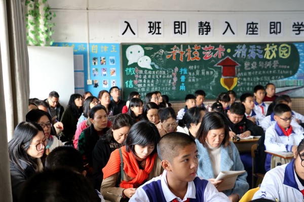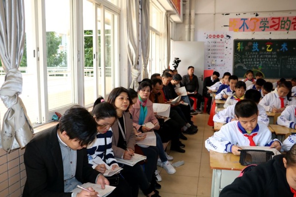 9:20,老师和家长们来到课堂听课。讲台前,老师们各显其能,有的神采风扬,激情澎湃;有的亲切自然,循循善诱;有的诙谐幽默,情趣盎然……同学们更是专心听讲,发言踊跃,认真讨论……师生互动,教学相长,笑声不断,掌声不断!听课的老师、家长们则挤坐在教室后面,有的干脆就站在教室外面,他们个个全神贯注,时而低头做笔记,时而点头微笑,时而鼓掌叫好……