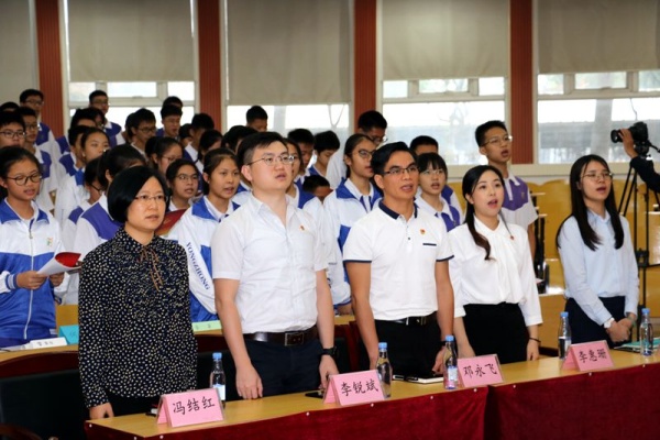首先,在主持人引领下高唱国歌,在隆重的国歌声中拉开了团课的序幕。在团课中,陈清茂校长带着大家从“辉煌的70年”、“青春建功新时代”、“共青团的使命及性质”、“新时代青年的新使命”四个方面进行团课授课,还有学生的现场互动。在团课中,陈校长用生动的历史事例讲述“五四”运动中的年轻人,为了国家的独立、富强、民主、自由奉献自己的生命,深深的震撼了在座的每一位师生。也让师生们体悟到“五四”之后的一百年,在中国共产党的领导下中国人民不断进步、富强的奋斗历程,从而自然而然地萌发出“我要跟党走”、“我是团员”的自豪感,明确了作为新时代的新青年肩上的责任和使命。陈校长的团课站位高、立意新、视野广、情怀深,能够站在“为谁培养人”、“怎样培养人”、“培养怎样的人”的高度进行设计,有活动、有思考、有视野、有情怀,在学生心灵深处埋下了一颗红色的种子。