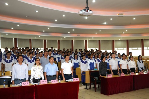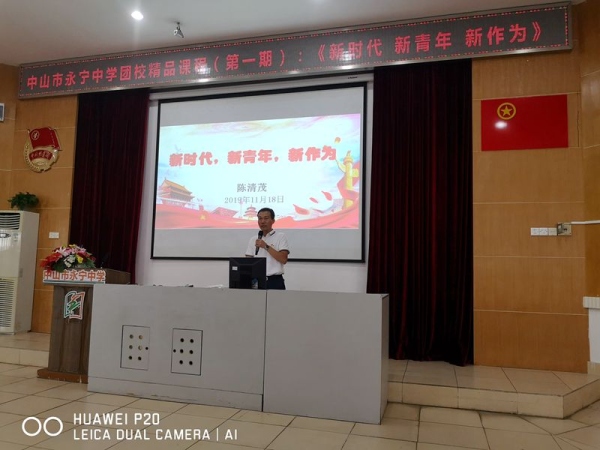 11月18日下午,为了增强团员、青年的责任感和使命感,提高大家的思想觉悟,增强团员、青年的政治意识、组织意识和时代意识,永宁中学团校在阶梯教室开展主题为“新时代,新青年,新作为”精品团课(第一期)。永宁中学团校全体讲师团成员和初二、初三年级100多名团员学生及入团积极分子参加了学习。活动由团委罗结晶老师主持,陈清茂校长主讲。活动还特邀了小榄镇党委副书记冯结红女士、小榄镇团委书记李锐斌先生、小榄镇教育线党委副书记邓永飞先生、小榄镇西区社区团委副书记李惠珊女士、小榄镇兄弟学校的团委书记、永宁中学全体行政领导也参加了本次的团课活动。
