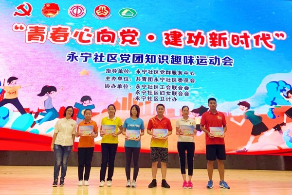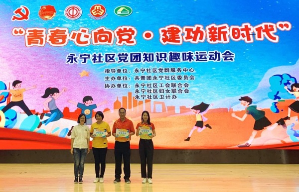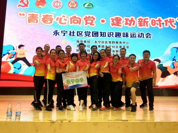 为了活跃学校党支部及教师队伍文化氛围,更好地促进党群之间的交流,激发教师学习党团知识的积极性,增强爱国爱党意识,不断向党组织靠拢,落实党中央立德树人的根本任务。由青年教师及部分党员骨干教师组成的永中代表队在陈清茂校长的带领下,于2019年10月27日上午参加永宁社区“青春心向党,建功新时代”党团知识趣味运动会并取得两个单项第二名,总成绩二等奖的优异成绩。