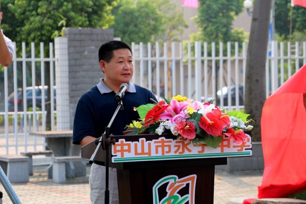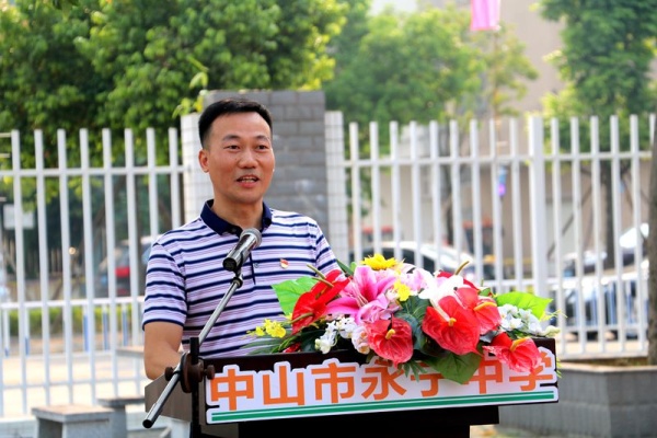 在杨副校长的主持下,章伟志校友、邓永飞副主任、布宝文委员、陈清茂校长共同为中山市永宁中学“伟志苑”揭幕,将活动推向高潮。章伟志校友在随后的讲话中回忆自己在永宁中学的青葱岁月,感慨良多。建设“伟志苑”的初衷就是让永中学生的安全得到保障,实现人车分流,让学校的环境更加优美,硬件设施更加完善。“伟志苑”的几棵大树,有他对母校和学子们的祝福和寄托。一棵树木的长成,离不开浇灌,正如学子们也离不开老师的辛勤付出和教育。章伟志校友愿母校能和大树一样,生生不息,桃李满园,殷切希望学弟学妹们以孔子的人格为标尺,以学修身,为国修业,稳稳地走向更高的知识殿堂,以优异成绩报答母校。接着,初一9班的黄安琦同学代表全体永中学子向校友、领导和老师们郑重承诺,一定会发扬永中的“博爱之心”和“奉献精神”,做一名拥有一颗博爱之心的永中学子;一定会励志勤学,立鸿鹄志,做奋斗者,把校友们传递的爱心接力棒接过来,让爱心行动传承下去。