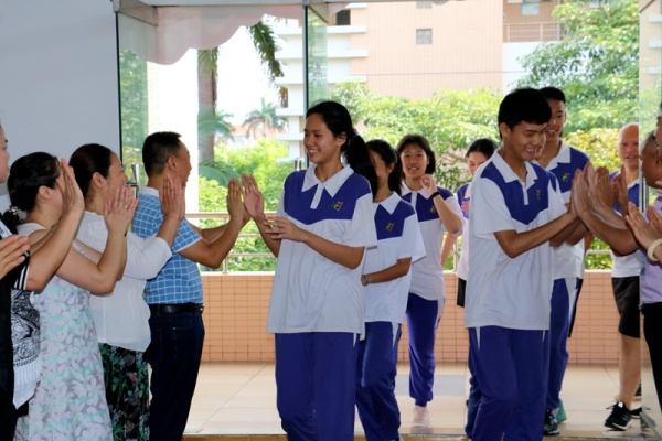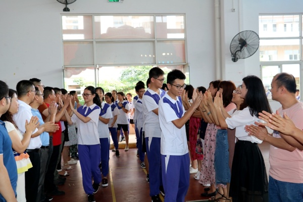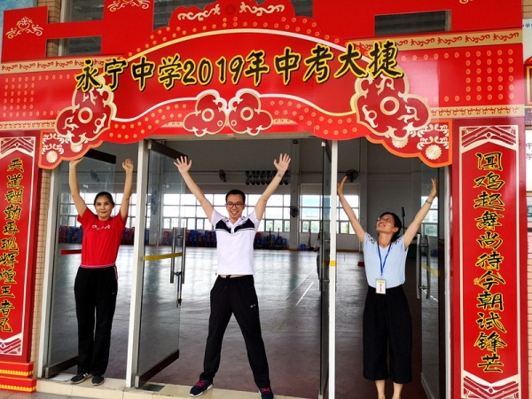 大会一开始,初三年级学生分班级依次走过精心设计的“永宁中学2019年中考大捷”的龙门,刘校长、文校长带领全体行政、初三老师们及家长代表分列两旁,和同学们击掌,为他们加油祝福,场面真切感人。