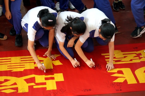 最后,全体初三同学在黄坤杰同学的带领下,一起高举右拳,大声喊出:“理想学校,星空体育来了,加油,加油,加油!” 之后,初三学生代表和家长代表在“迎接人生挑战,中考再创辉煌”横幅上签名留念,接着全体初三师生带着坚定的目标、饱满的自信、坚强的意志也在横幅上郑重签名,表达“中考必胜”的信心。