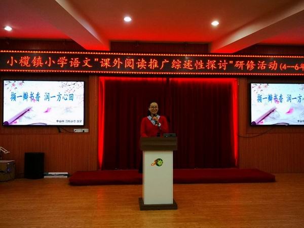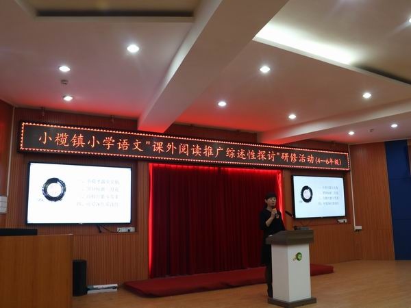 这次教研活动主要分为三个环节。首先是由菊城小学赵莹老师进行题为《颉一瓣花香,润一片心田》的讲座。在专题讲座中,赵老师总结了全镇76份上交的阅读素材经验,就“读什么书”、“怎样读书”、“评价机制”等方面进行介绍,还针对菊城小学语文科组在课外阅读推广方面的“四个一”活动以及菊城小学四年级语文备课组在课外阅读指导和评价方面的措施进行解读。