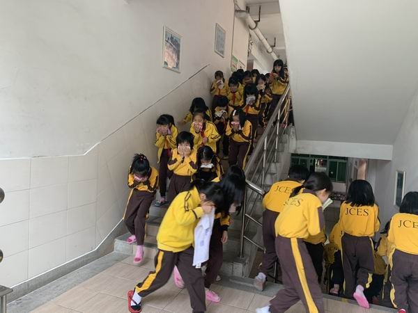 中午一点十分,随着警报声的响起,各班老师和楼层负责人第一时间到达指定位置,组织学生用水沾湿手帕捂住口鼻,弯腰按疏散路线有序撤离,顺利到达空旷的安全地带,演练共用时约3分钟。随后,各班生活老师核实了班级学生人数,无推挤或踩踏事故,一千多名师生全部安全疏散。整个疏散演练紧张有序、效果良好。
