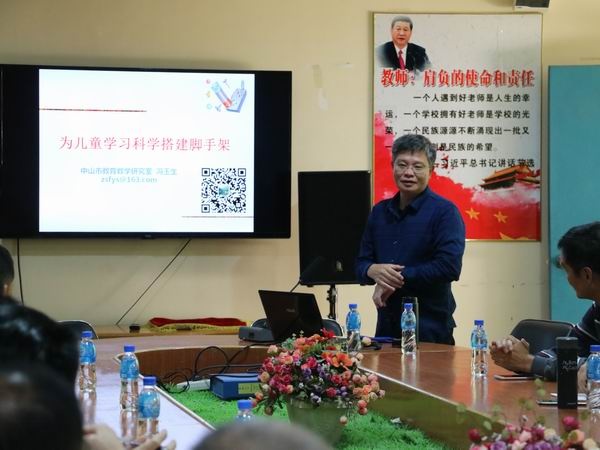 活动第一项议程是中山市教研室冯玉生部长给老师们做了一个科学课堂教学的指导性讲座《给儿童学习科学搭建脚手架》。通过这次讲座,老师们充分理解了什么样的探究才是真探究,也体会到了科学探究、材料、提问和回答、任务单在儿童学习科学过程中重要的脚手架作用。冯部长的讲座从理论到实践、旁征博引,既让老师们从理论的高度知道了为什么要这么做,也通过具体实例理解了该怎么做。冯部长在满满一个半小时的讲座中侃侃而谈,生动精辟的讲座让聆听讲座的老师们如醉如痴,时不时点头赞叹、时不时幡然醒悟。