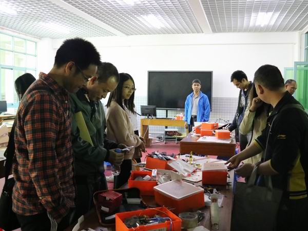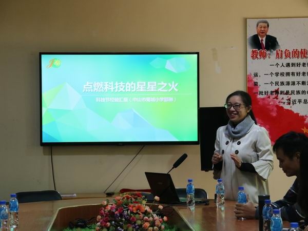 聆听完冯部长的讲座之后,菊城小学邵琳老师代表菊城小学科技团队做了科技节经验介绍。最后黄圃镇科学骨干教师一行参观了菊城小学的科技室场。菊城小学简单朴实却能很好契合科技教育及科学校园的科教功能室场和便于开展科教活动的校园环境让教师们若有所思。