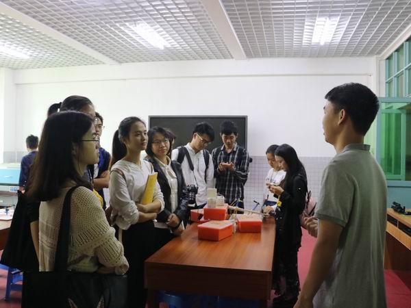16日上午,教师进修学院周朝华老师带领中山市小学科学新教师们抵达中山市菊城小学。首先在陈新华主任的引导下参观了科教氛围浓厚的校园。菊城小学简单朴实却能很好契合科技教育及科学校园的科教功能室场和便于开展科教活动的校园环境让新入职的科学教师们羡慕不已。