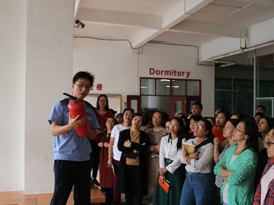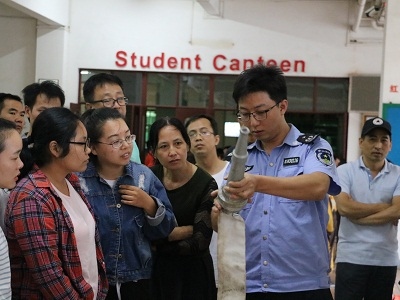 讲座结束,蔡警官亲自示范如何正确使用干粉灭火器和消防栓水带。随后,负责学校安全的袁有民副校长还现场演示了灭火器的操作程序。老师们跃跃欲试,并分组进行演练。