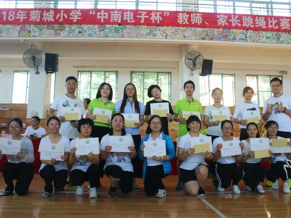 5月24日下午,由菊城小学工会和家长委员会联合举办的2018年菊城小学“中南电子杯”教师、家长跳绳比赛在学校体育馆隆重举行。本次比赛全校教师、家长共计二百三十五人参加了比赛。