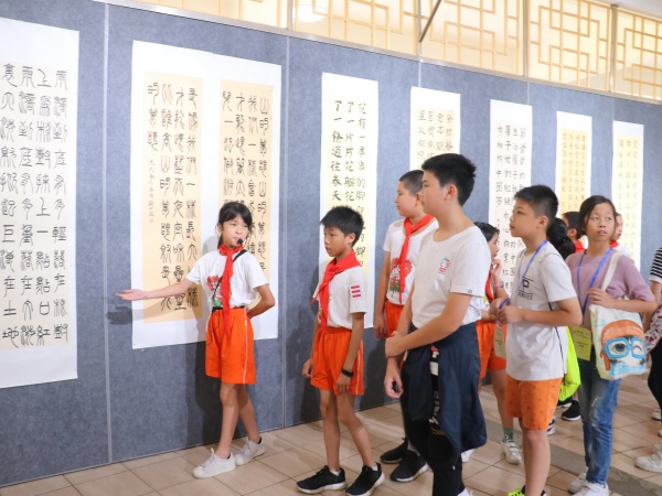 香港蔡衍涛小学的小朋友们一下车就受到了菊小同学的热情欢迎。在学校少先队的组织下,全体大队委和来自四(1)、五(1)、六(1)三个国际英语特色中队的同学分成8个小队,一对一为香港的同学担任“校园红领巾导游”。大家首先带着刚刚认识的新朋友参观了红领巾书画展,欣赏了“小雏菊”合唱团和管乐团的精彩表演。客人们纷纷为菊小的社团和队员们鼓掌。