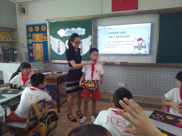 首先,由丰华学校张佩霞老师给四(5)班学生上了一堂精彩的心理活动课,主题为《张开想象的翅膀》。张老师带领同学们通过有趣的热身活动,让大家迅速集中了注意力,投入到课堂当中。课堂开始时,张老师通过有趣的图片引出了课题。接着通过两个活动让学生们掌握了想象的两个法宝。同学们带着想象的法宝进行闯关游戏,分别考验了他们听的想象、看的想象、用的想象。最后综合运用创造想象,制作出属于自己的作品。张老师语言风趣幽默,反馈丰富到位,孩子们在有趣的游戏当中,享受着想象的乐趣。