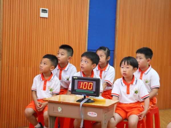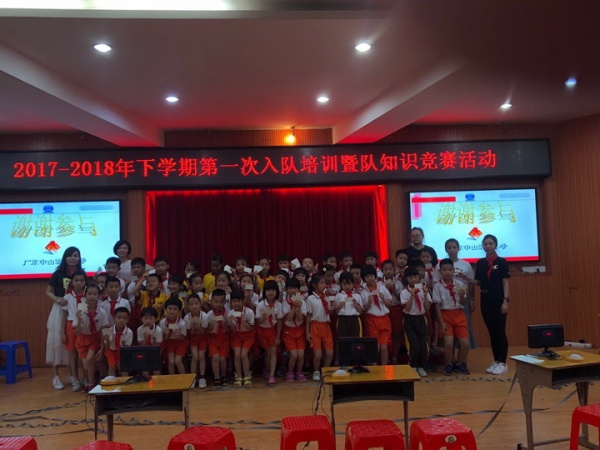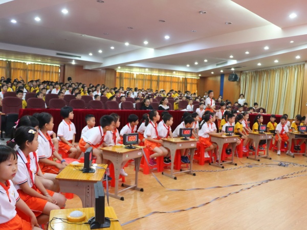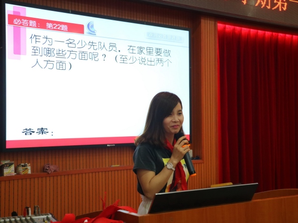 本次入队培训以知识竞赛的形式展开,由大队副辅导员王甜老师和关永钏老师组织。竞赛开始前,王甜老师带领所有队员和同学们边唱队歌边做手语操。接着,各中队少先队员代表和预备队员组成答题小队。本次竞赛分为必答题、抢答题和实操比赛题三个环节。必答题要求各队先选择题号,每队必须答3题,答对加10分答错或不答不扣分,观众可以补答。在第一轮的比赛中所有的队伍抽中的题目全都答对,这也体现了队员们对少先队知识都比较了解。最激动人心的是抢答题环节,这需要队员们眼疾手快,通过这一环节的比拼,每一个小队的分数也拉开了差距。实操项目,要求参赛队员在规定时间内自己系好红领巾,关永钏老师面对所有队员和预备队员们当场演示正确系红领巾的方法和敬标准队礼的姿势。在整个活动中各中队队员们和预备队员们参与的积极性非常高。