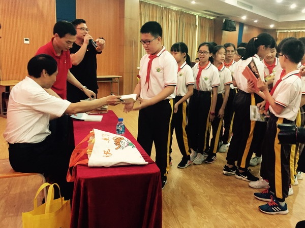 活动最后,周大新老师为六年级同学签名留念,同学们手捧周老师的作品,有序地排队等候。在签名过程中,有很多孩子跑到周老师身边,将自己的想法与老师进行交流……