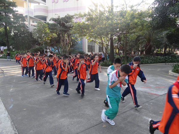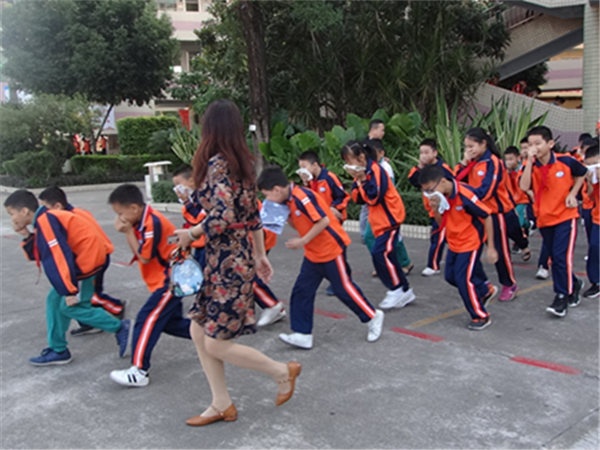 随后,一阵急促的警报铃声响起,学生们在班主任的带领下,停下手中的一切活动,迅速找出自己所带的毛巾,掩住口鼻,俯首弯腰,有秩序地按照学校预定的路线跑步撤离教学楼。到达操场后,同学们马上蹲在地上,班主任马上整队清点人数,确保全部学生都到操场指定地方“避险”。整个过程,同学们都保持沉着、冷静的心态,有序地排队下楼。演练整个过程仅用了4分50秒时间,期间并没出现任何安全问题。