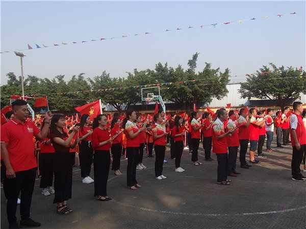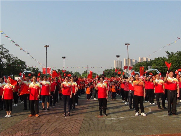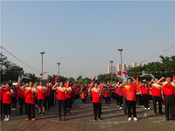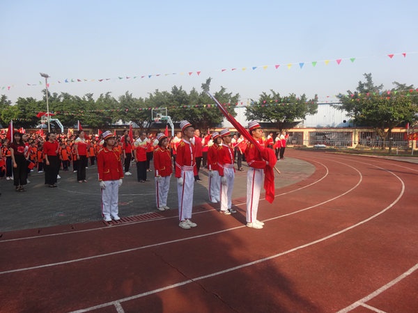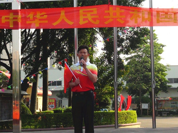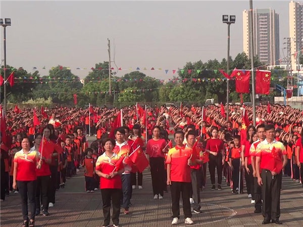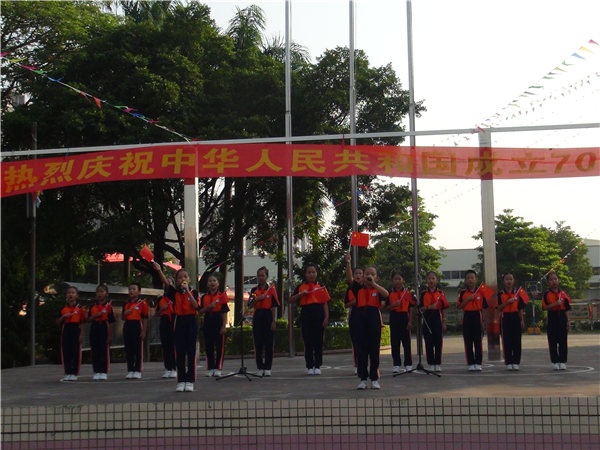 随着国旗冉冉升起,全体师生庄严肃穆,在国旗下少先队员敬礼,非少先队员行注目礼。国旗迎风飘扬,全体师生齐唱国歌,为祖国献礼。紧接着刘万轩校长在国旗下发表热情洋溢的讲话,祝愿祖国昌盛繁荣,希望同学们时刻把祖国放在心中。刘校长演讲完毕后,全体师生挥舞手中红旗,在台上同学领唱下齐唱《我和我的祖国》,礼赞新中国。接着全体师生在主持人的带领下进行呼号,祖国万岁,祖国万岁,把自己对祖国的爱抒发出来。由学校朗诵队朗诵《中华少年》,铿锵有力的朗诵,扣人心弦,震撼全场。最后由学校何信富、谭军、刘秀、李莉老师为师生们带来朗诵《我骄傲,我是中国人》,将整个庆祝活动推向高潮。