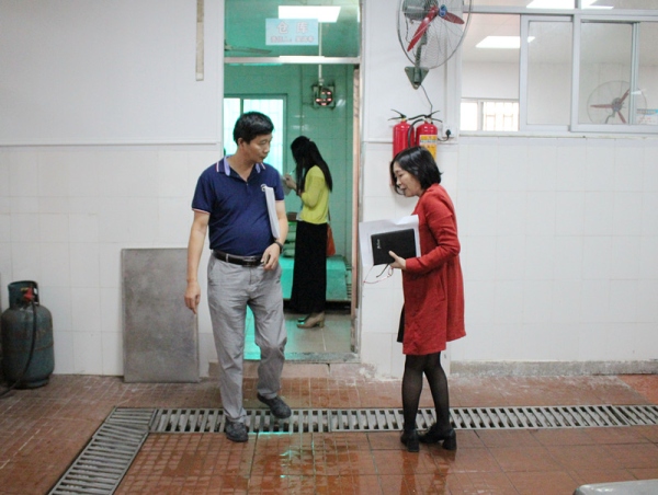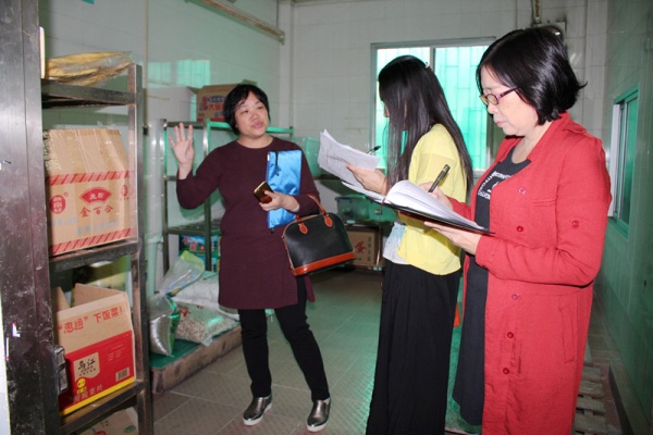检查组一行首先听取吉安学校校长韦志海有关食品安全和卫生防疫工作的汇报,并查阅相关资料。接着对食堂及校园各个区域的卫生安全情况进行实地查看。其中检查组重点检查了食堂的食品及环境卫生情况。详细检查了食堂食品存储间、食品原材料加工间、食品烹饪间、饭菜分配间、食品留样柜、餐具消洗各环节的运行情况,并认真查看了学校的食堂制度建设、采购记录台帐、索票索证资料、饭菜试尝记录、留样记录,询问食堂相关管理人员等。吉安学校的食堂能够建立各种规章制度,严格按照食品安全要求进行生产操作,食品卫生安全达标。另外校园环境优美、干净,室内物品摆放整洁,能做好通风消毒工作。对于学校的食品安全和卫生防疫工作,检查组除了给予充分肯定,同时也提出了更高的希望和要求:1.食品安全无小事,希望学校要继续坚持做好每一项工作,落实好食品每个环节的操作规程。2.要加强疾病防控预防工作力度,完善疾病防控工作制度。3.要做好设施设备的更新。