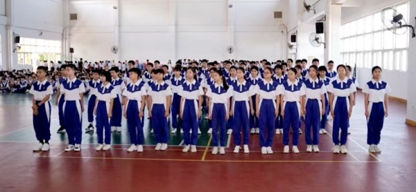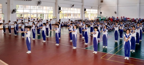 6月11日下午4点,中山市永宁中学在学校体育馆隆重举行“天乐杯”初一年级班际广播体操比赛。天乐咨询服务公司董事长、永宁中学家委会会长梁辉洪先生、天乐咨询服务公司财务总监刘健先生、永宁中学家委会副会长陈锦萍女士莅临现场,陈清茂校长、杨青华副校长、戴放良主任、王志珍副主任、罗结晶副主任等学校行政领导出席观看比赛。钟敏、朱红卫等老师担任评委,何健君级长主持。
