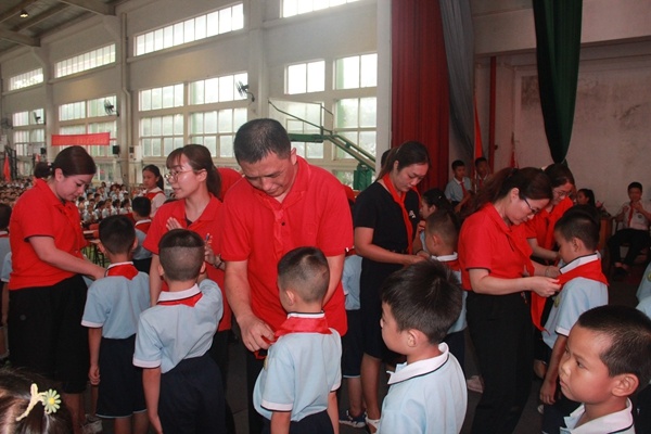 随后,大队辅导员殷煜毅老师宣读新队员名单,艾斌校长带领全体行政和老师们一起为新队员授予红领巾。新队员们在红领巾的映衬下,个个朝气蓬勃、斗志昂扬。