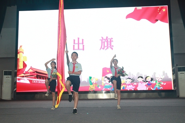 全体新入队的同学在大队长岑金燕同学的带领下,在庄严的队旗下,高高地举起右手大声宣誓。那响亮的声音在体育馆回荡,小队员们一定不会辜负家长和老师的期望,在星星火炬的指引下,牢记党的教诲,全面发展,茁壮成长。