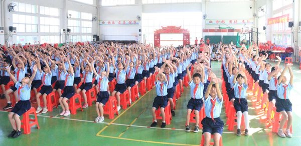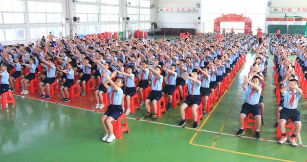 全校师生共同参与了此次比赛活动,各班级同学穿着整齐,精神抖擞,步伐自信。音乐响起,比赛开始了,随着动感韵律,一双双小手缭绕向上,如行云流水,向阳而升,形舒意广;一双双小手整齐划一,向两边舒展,孩子们的心儿也随着那展开的双臂,遨游在无垠的太空;一双双小手握拳,向左摇,划出了一道彩虹,向右摇,蓝了一片天空;踏着跳动的音符,同学们时而像燕子伏巢将醒,时而像鹊鸟展翅欲飞,有力的双臂挥舞斗志,灵动的身躯呼唤梦想。点点头,甩甩肩,挥臂间,踢走疲劳,消除焦虑,释放情绪,唤醒能量。